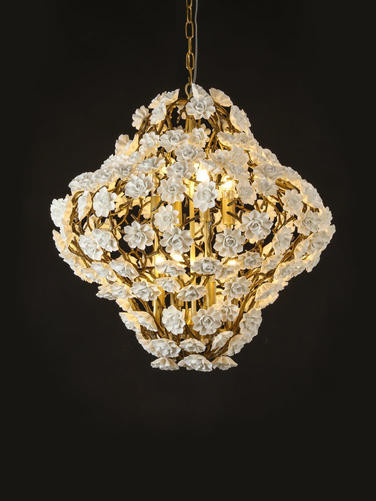 Post-Modern Light Luxury Brass and Ceramics Flower Art Chandelier for Living/Dining Room/Bedside/Hallway