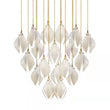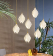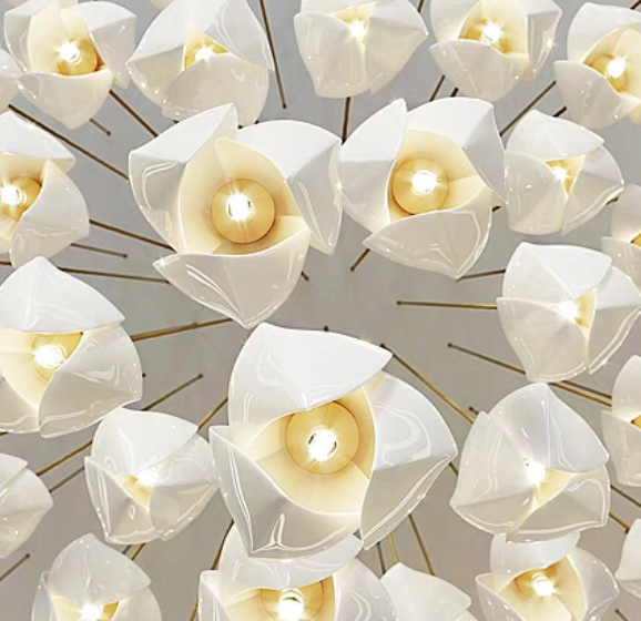 - This long chandelier is made of ceramic and metal, metal adjustable hanging wire staggered hanging by three ceramic petals wrapped around the light source, like a flower bud first bloom, the shape is new, showing elegance and beauty.You are free to match it with your room lighting needs, it can be two or three together, hanging next to your bed as night lighting, or multiple compositions, hanging above your dining table as a dining pendant, or a staircase light.Whether as a lighting fixture or a decorative piece,it is a good choice.